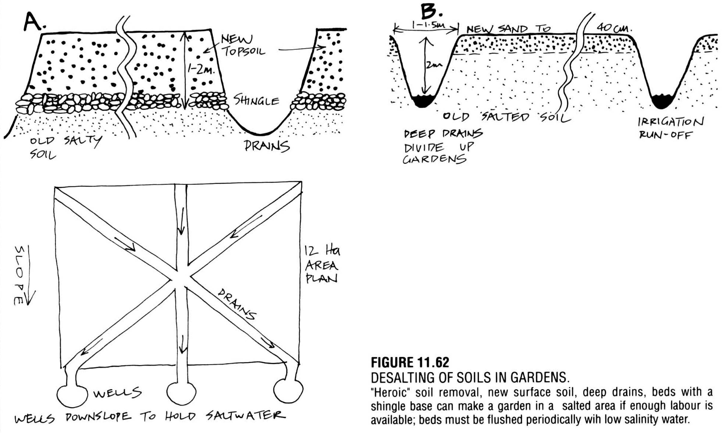 Where salt contamination is severe, the Saharawi people of North Africa developed two approaches that depend on irrigation to leach excess salt. Both methods fall into the category of an extreme intervention for an extreme situation: