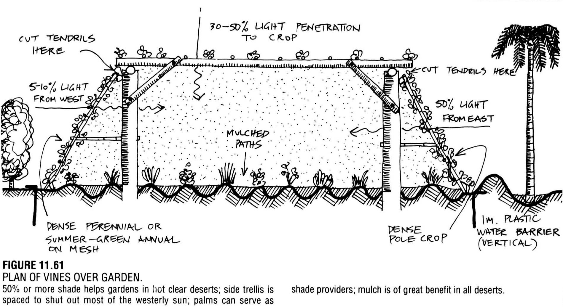 Horizontal trellis bars at 1-2m spacing furnished with grape vines throw a shade system over the greater part of your vegetable garden, preventing light saturation.