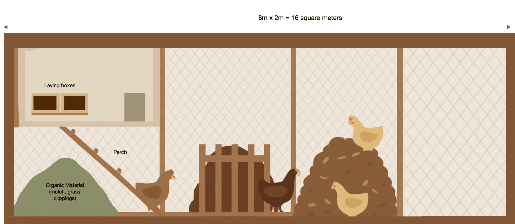 - 2m×2m: a coop above ground with nesting boxes, dust bath, and water