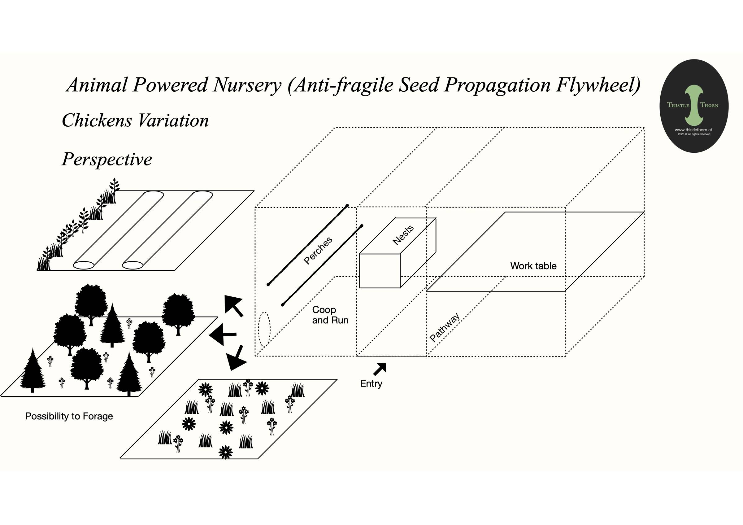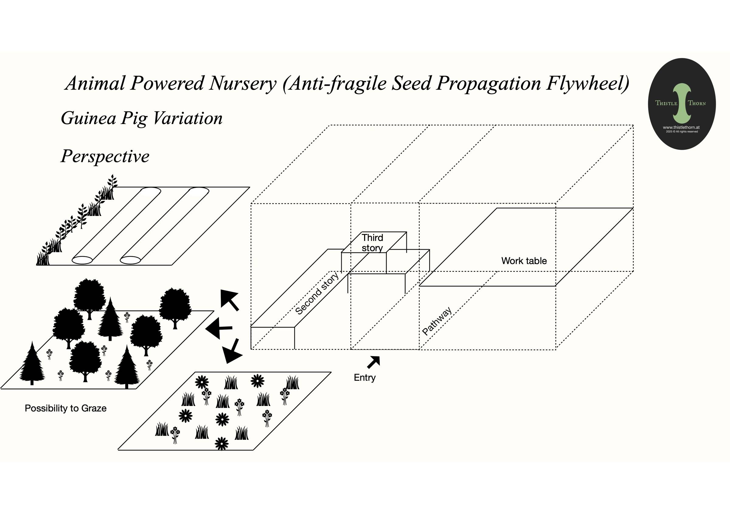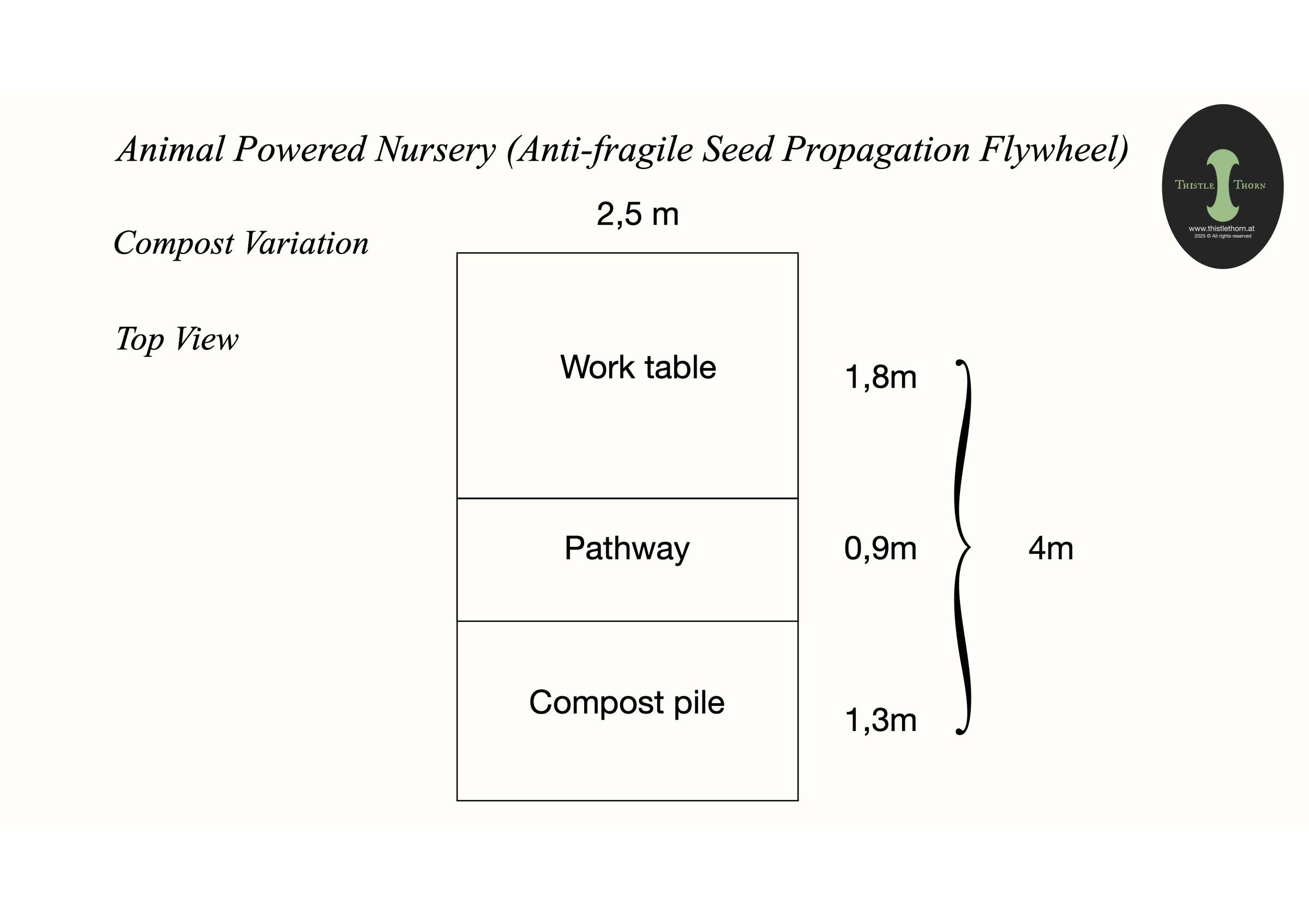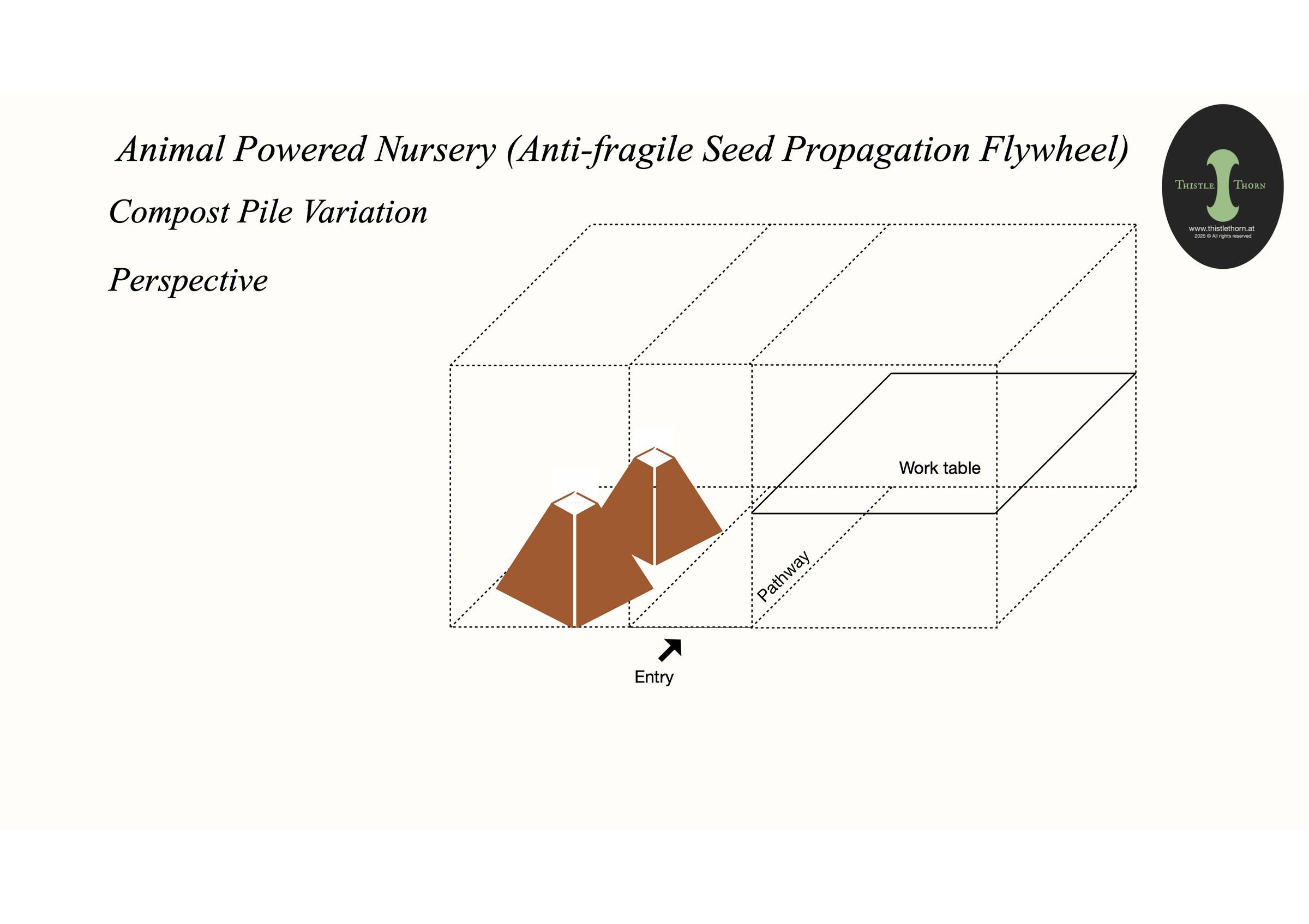 The solution is to create a nursery flywheel that builds a solid base for any garden project (small hobby or large and ambitious), which compounds forces with the natural world (we can power the nursery with animals and/or composting piles) and makes the task easier each time.