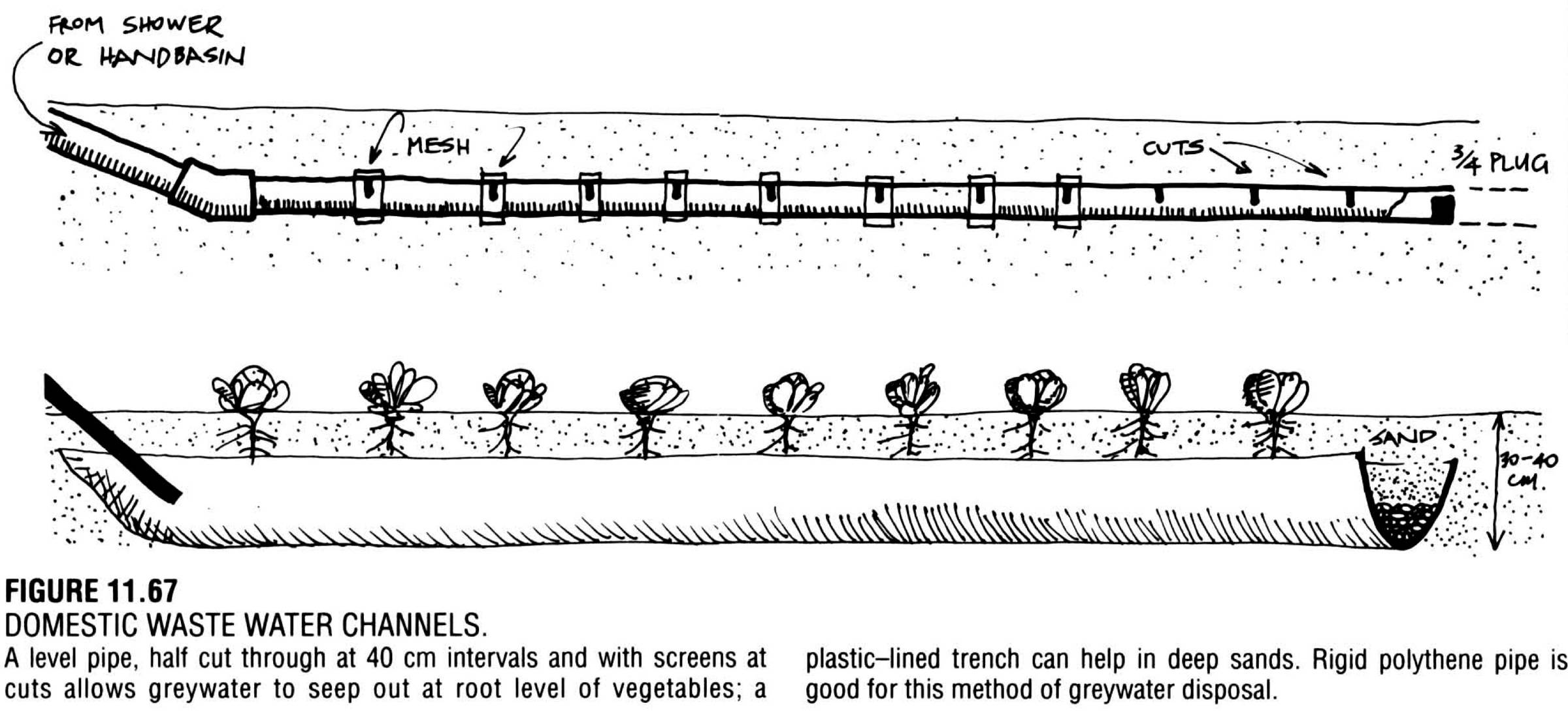 - Slot-pipe from greywater: 3-5 cm diameter slotted pipe fed from sinks via grease trap, positioned 30 cm below surface