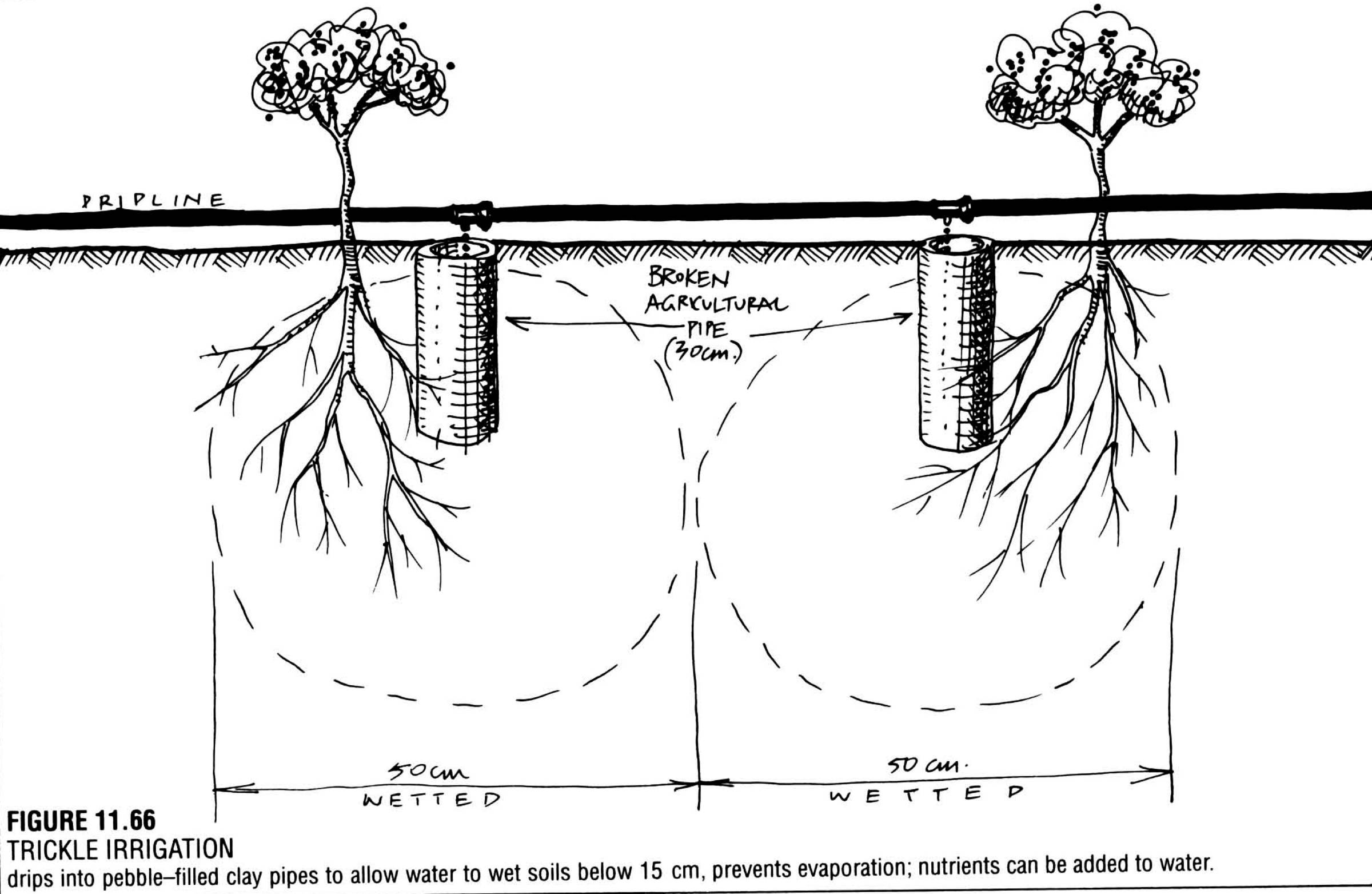 - Trickle + pot/pipe systems: Deeper pipes (up to 0.5m) for maturing trees