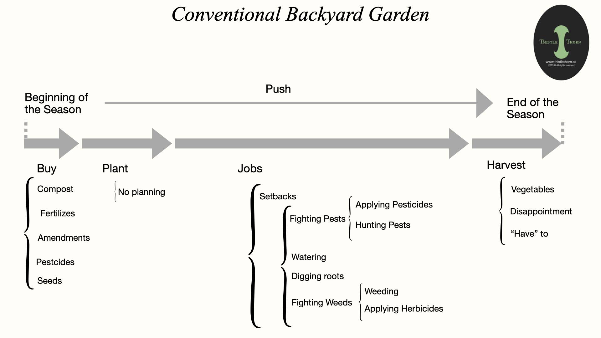 This is the production line garden. It requires constant force to move forward. Stop pushing, and everything grinds to a halt. The soil depletes. The pests return. The weeds take over. You're trapped in an expensive, exhausting cycle that treats symptoms instead of building systems.