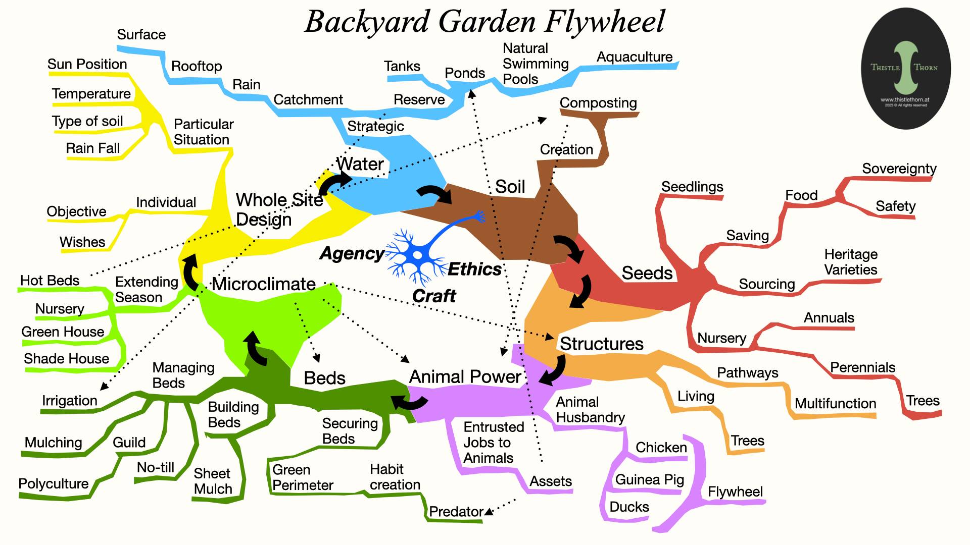 Normal gardens are production lines pushed forward with work. Permaculture gardens are flywheels conceived and managed with intelligence, trials and errors, and creative problem-solving.