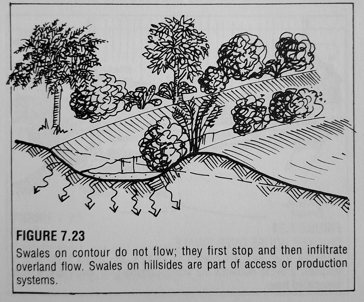 Swales are multifunctional permeable ditches on contour. They occur naturally in nature through the effects of water, wind, gravity, and animal activity moving earth in the process.